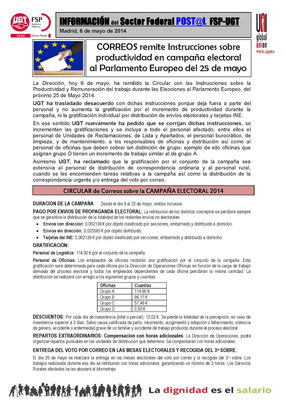 ningún tipo de pudor, han usado las anteriores instrucciones para éstas elecciones europeas. Como siempre dejando fuera del reparto a los empleados de: Unidades de Reclamaciones, de Lista y Apartados, el personal Burocrático, de Limpieza y Mantenimiento, los Responsables de las Unidades de Oficinas y Distribución.... y cómo no, al personal rural, cuando por necesidades de servicio se les encarga la distribución de correspondencia urgente y/o entrega del voto por correo.
